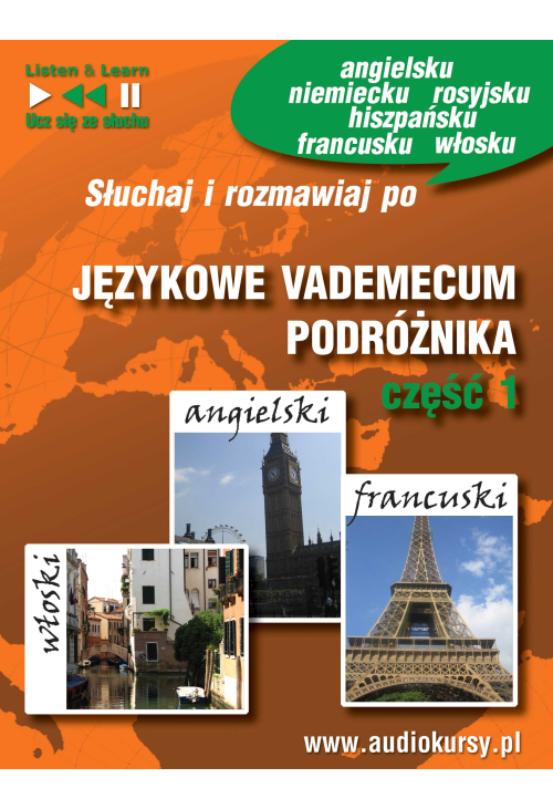 Słuchaj i rozmawiaj po angielsku, francusku, włosku, hiszpańsku, niemiecku i rosyjsku. Praktyczny kurs dla tych, którzy wyjeżdżają za granicę. Kurs uczy najbardziej przydatnych zwrotów w podróży, potrzebnych na lotnisku, w hotelu, restauracji itp. Kurs ułatwia dogadanie się i załatwienie najbardziej podstawowych spraw za granicą. Dodatkowo w książeczce PDF znajdują się praktyczne informacje dotyczące wymowy, alfabetu, form grzecznościowych czy zasad posługiwania sie językiem.
