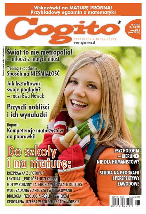 „Cogito” to jedyny młodzieżowy DWUTYGODNIK, który z sukcesem pomaga młodym ludziom w wieku 15–19 lat przygotować się do matury z języka polskiego, matematyki, WOS-u, biologii i geografii. Publikuje arkusze do egzaminów pisemnych, zestawy pytań i odpowiedzi do ustnych.
