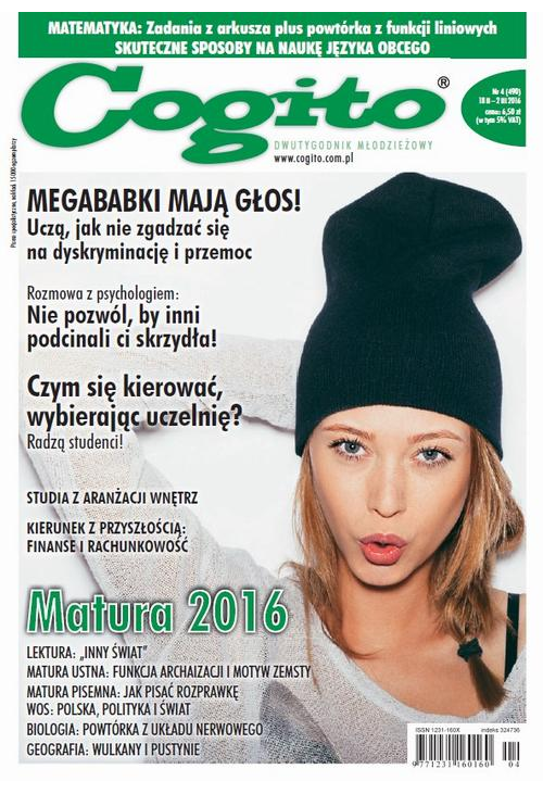 „Cogito” to jedyny młodzieżowy DWUTYGODNIK, który z sukcesem pomaga młodym ludziom w wieku 15–19 lat przygotować się do matury z języka polskiego, matematyki, WOS-u, biologii i geografii. Publikuje arkusze do egzaminów pisemnych, zestawy pytań i odpowiedzi do ustnych.