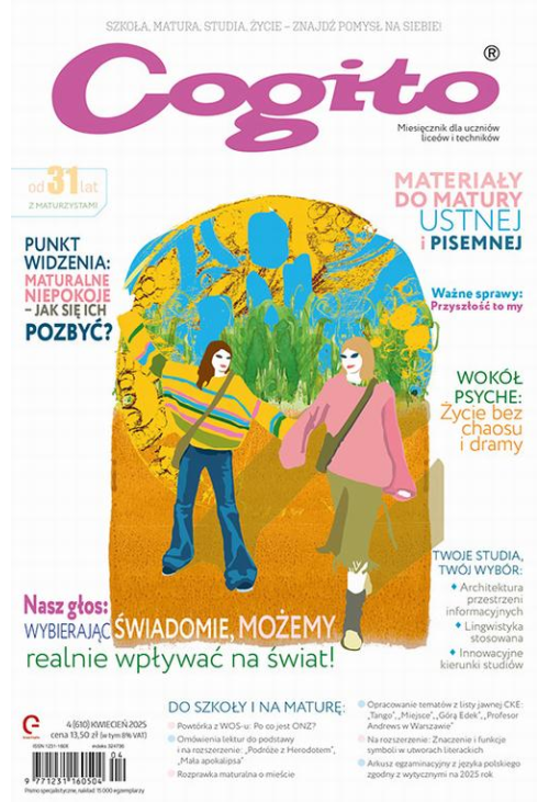 „Wybierając świadomie, możemy realnie wpływać na świat” – przekonują uczennice II LO im. Generałowej Zamoyskiej i Heleny Modrzejewskiej w Poznaniu. Mają rację, dlatego też wybory życiowe i edukacyjne są motywem przewodnim tego numeru „Cogito”. To od nas zależy, jak będziemy podchodzić do wyzwań. Mamy przecież wybór: poddać się maturalnym niepokojom czy z nimi wygrać? Iść na studia, by wykorzystać te 5 lat nauki na samorozwój i poznawanie siebie, a może nie?