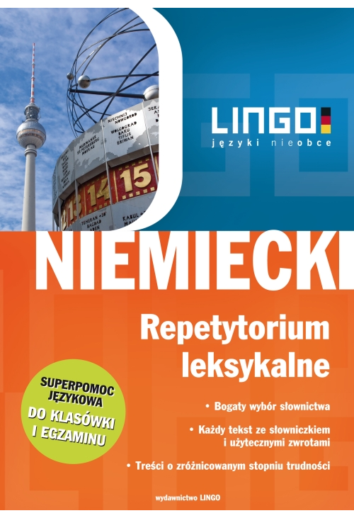 Niemiecki. Repetytorium leksykalne należy do znanej serii repetytoriów językowych Lingo. Przeznaczone jest dla uczniów gimnazjów i szkół średnich, a także studentów i osób przygotowujących się do egzaminów językowych. Zróżnicowany stopień trudności tekstów i bogata tematyka sprawia, że każdy, uczący się języka niemieckiego, znajdzie tu coś dla siebie.