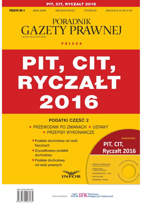 Od 1 stycznia 2016 r. w podatkach dochodowych obowiązuje zasada dokonywania korekty przychodów i kosztów na bieżąco, a nie jak do końca 2015 r. nakazywały to robić organy podatkowe – zawsze wstecz. Zlikwidowany został również obowiązek dokonywania korekty kosztów z tytułu należności nieuregulowanych w terminie. Publikacja zawiera: Ujednolicone teksty PIT, CIT i Ustawy o zryczałtowanym podatku dochodowym Rozporządzenia wykonawcze Komentarz do zmian w PIT, CIT, ustawie o zryczałtowanym podatku dochodowym wprowadzonych w IV kwartale 2015 r. i od 1 stycznia 2016 r. w formie przewodnika po zmianach. Do publikacji dołączona jest płyta CD zawierająca ww. przepisy podatkowe na 2016 r.
