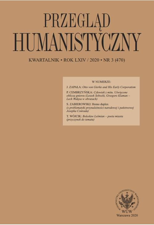 Jakub Zapała – Otto von Gierke and His Early Corporatism 7Patrycja Cembrzyńska – Człowiek z mitu. Uświęcone oblicza gniewu (Leszek Sobocki, Grzegorz Klaman – Lech Wałęsa w obrazach) 19