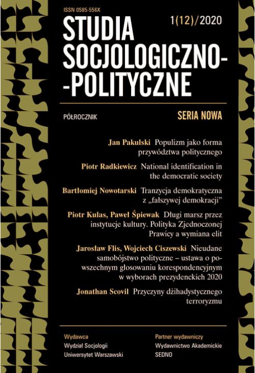 W numerze 1(12)/2020 „Studiów Socjologiczno-Politycznych. Seria nowa” autorzy analizują zagadnienia związane (1) z przywództwem politycznym w formacie populistycznym, (2) z formami kształtowania się i przejawiania tożsamości narodowej w społeczeństwie demokratycznym, (3) analizują pojęcie „fałszywej demokracji”, (4) politykę PIS i partii sojuszniczych wobec instytucji kultury i proces wymiany kadr zarządzających tymi instytucjami, (5) nieudaną próbę przeprowadzenia wyborów prezydenckich w Polsce w formie powszechnego głosowania korespondencyjnego wiosną 2020 roku oraz (6) poddają analizie religijne, psychologiczne, polityczne i społeczno-kulturowe przyczyny dżihadystycznego terroryzmu. Ponadto w dziale z Warsztatu socjologów spojrzenie na Konkurs Piosenki Eurowizji z wykorzystaniem narzędzi analizy socjologicznej oraz jeden esej recenzyjny i dwie recenzje.